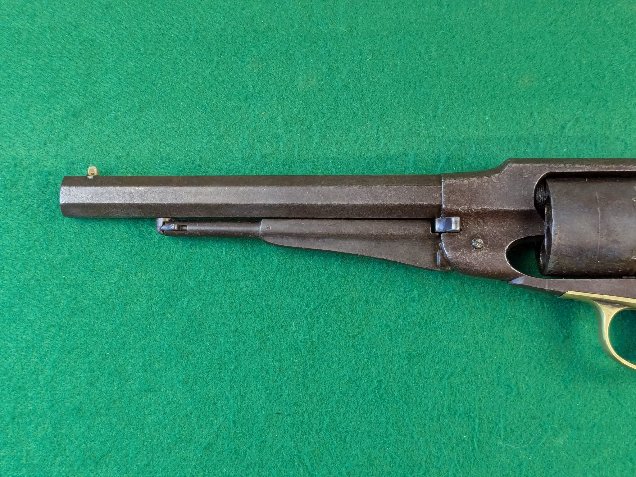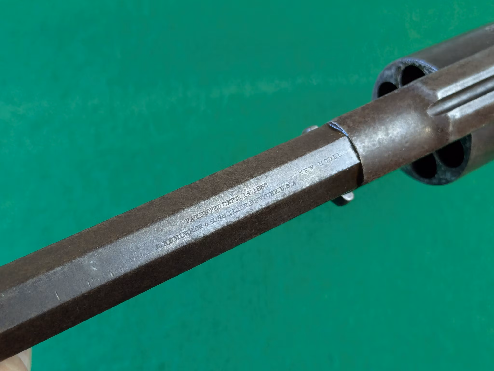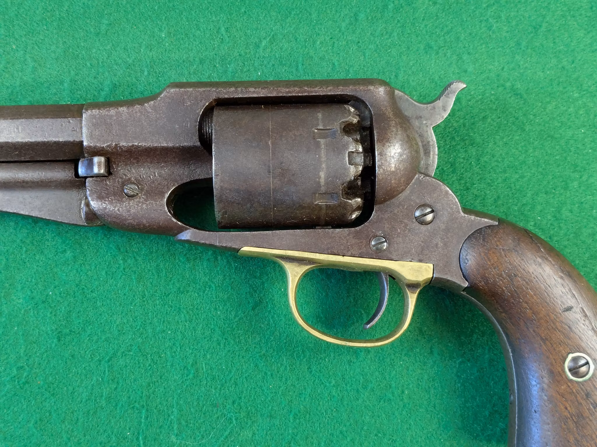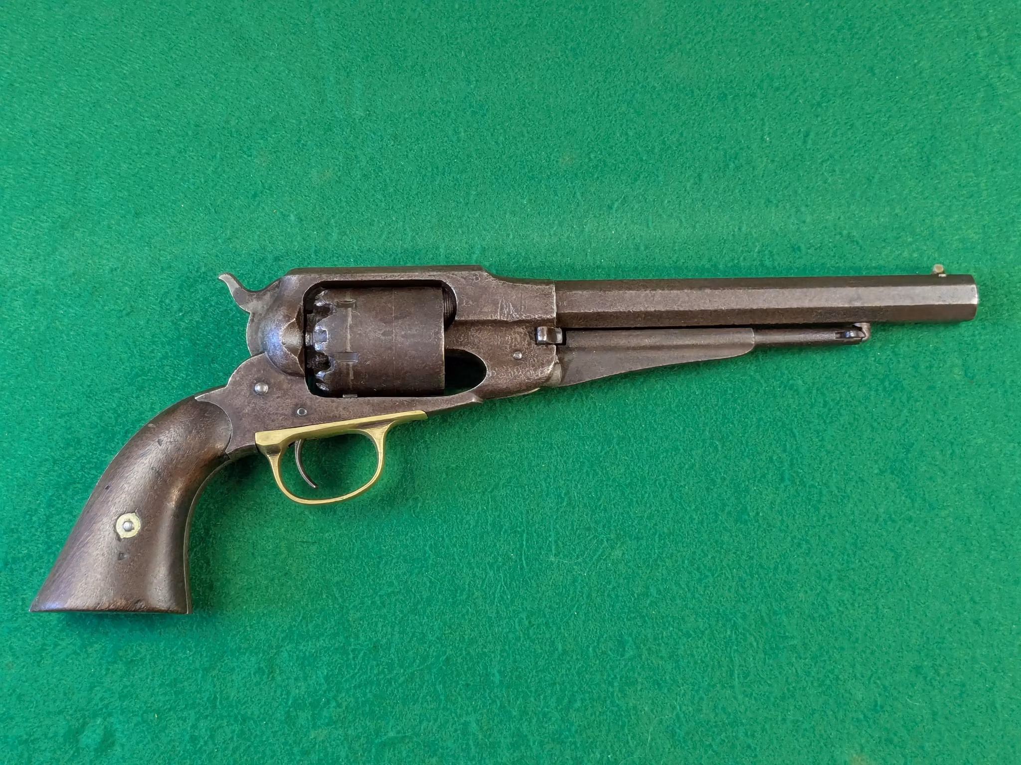 Remington New Model Army Revolver med serienummer 23496. Tillverkad i Maj månad år 1863 av E. Remington & Sons i Ilion, New York State. En av de 106 000 exemplar som såldes på kontrakt mellan nordstaterna och Remington under amerikanska inbördeskriget.