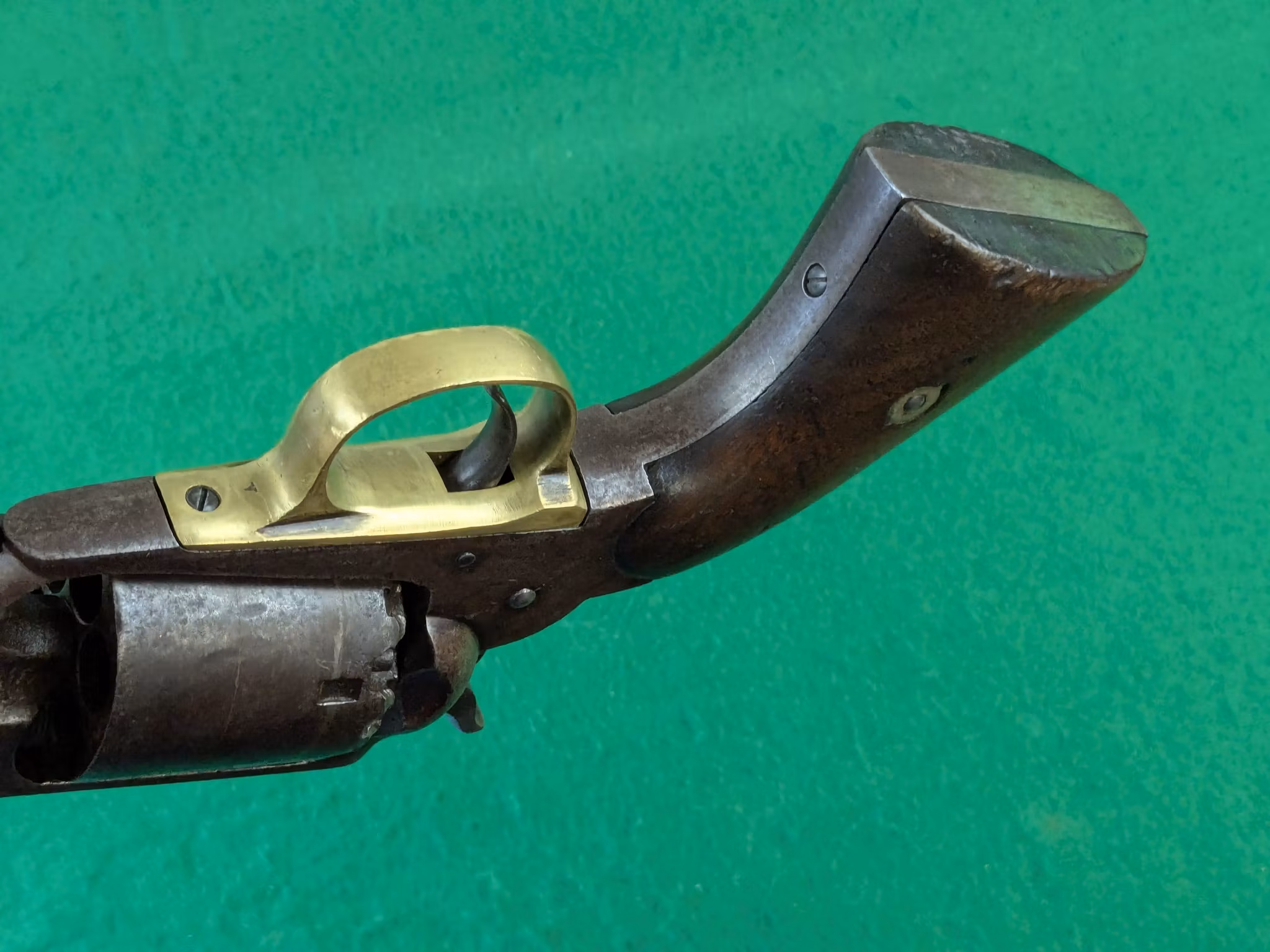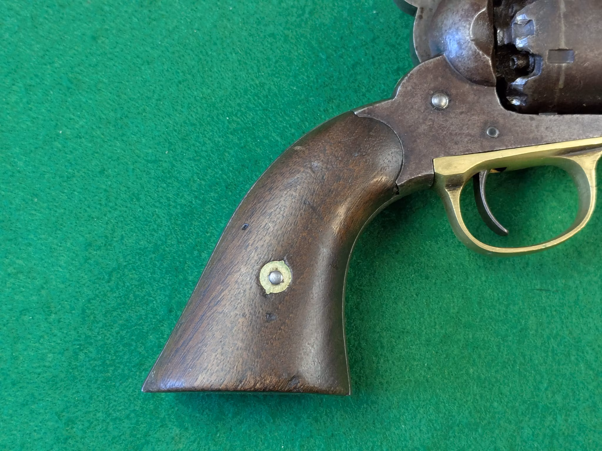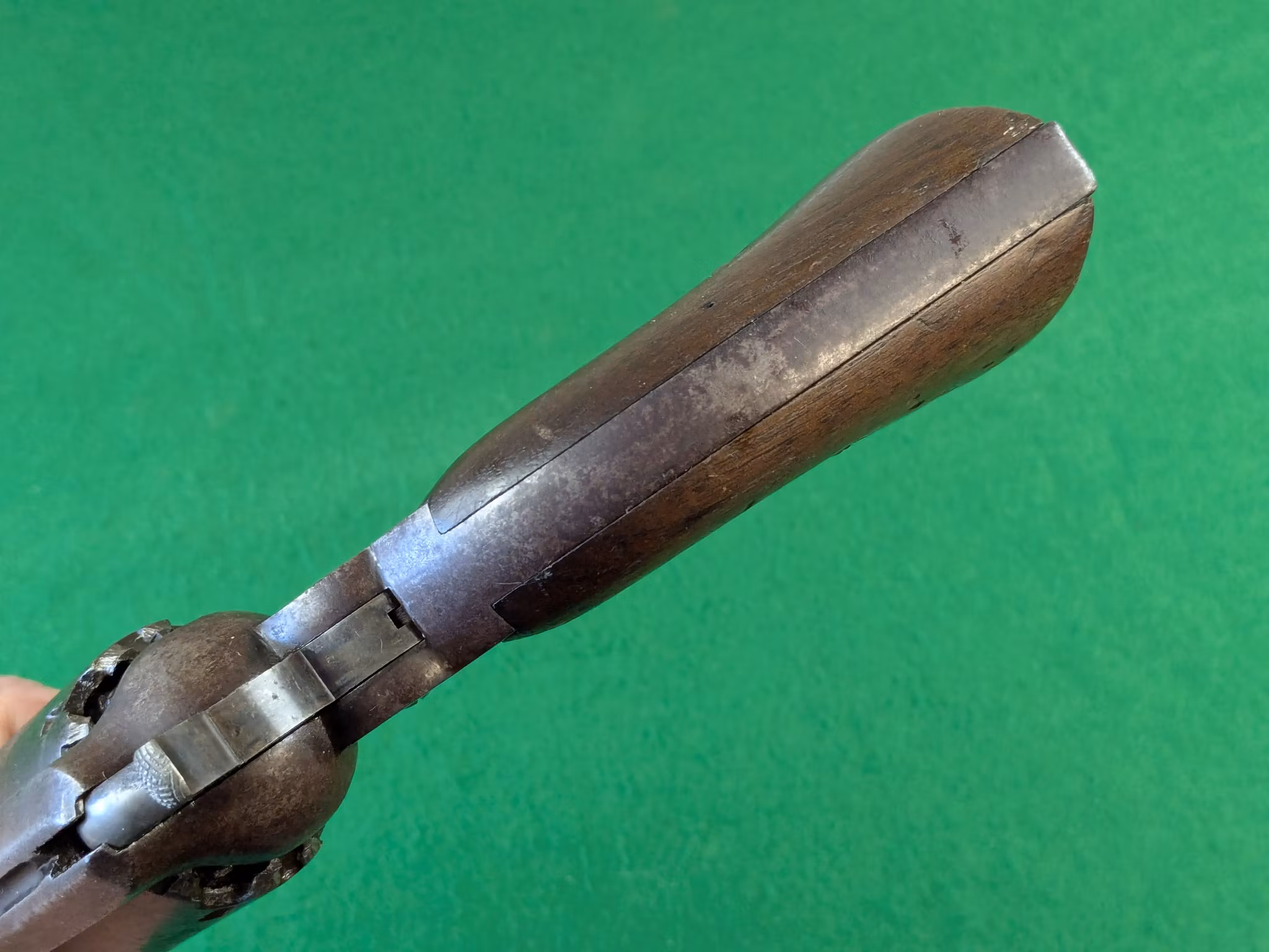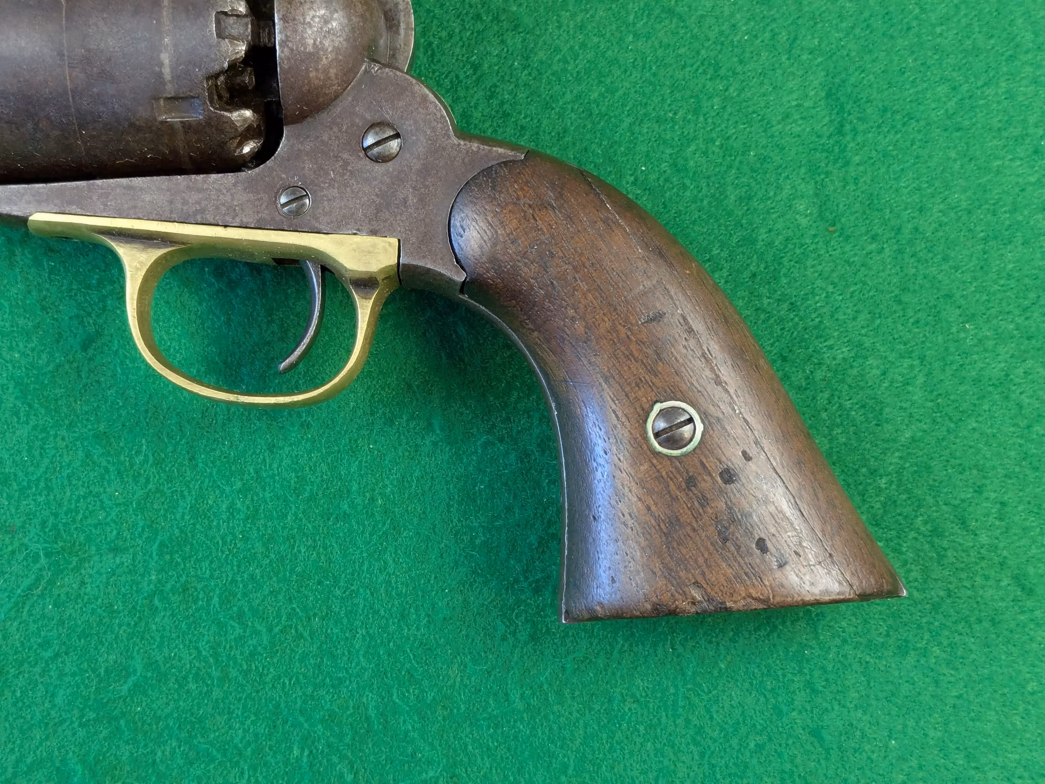 Chokladbrun patina jämnt fördelad över hela revolvern. Kolvsidor med mycket god passform. Den vänstra har en limmad spricka. Slagmärken runt trumaxelns fingergrepp.