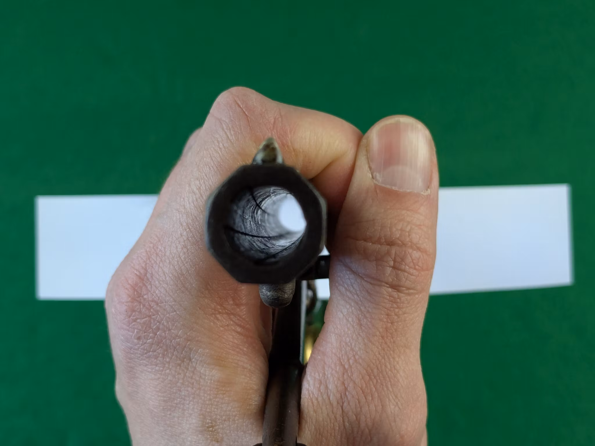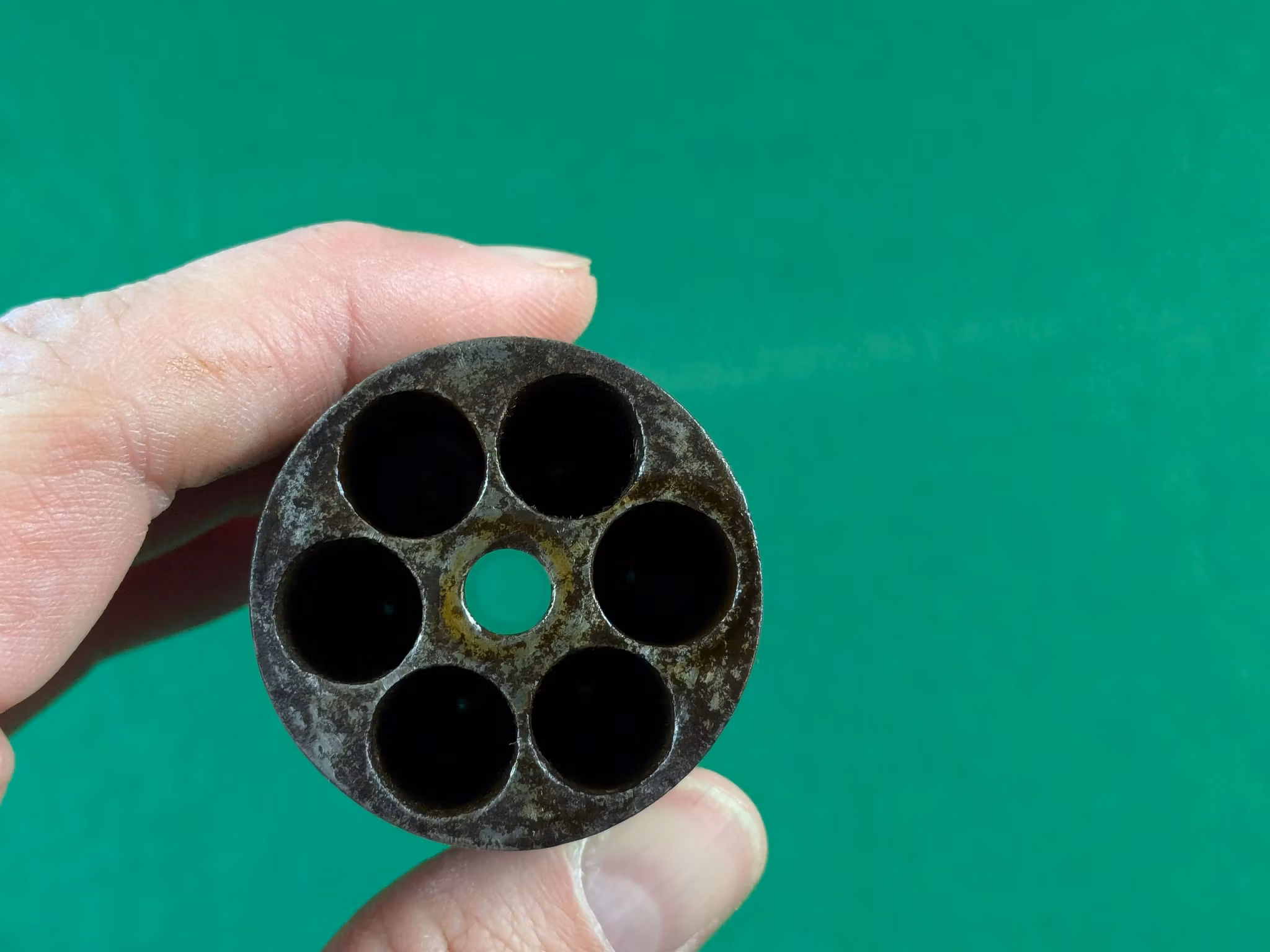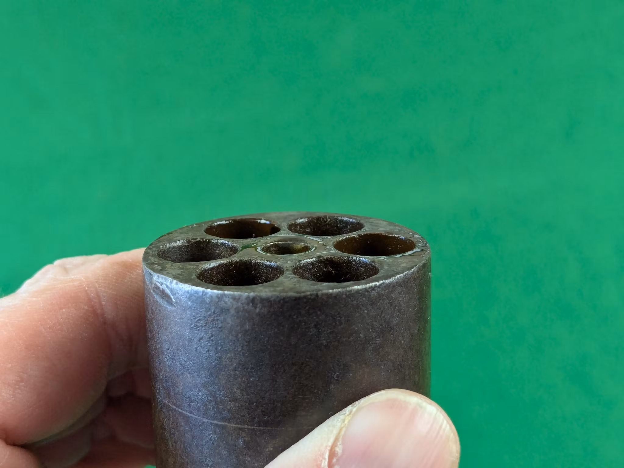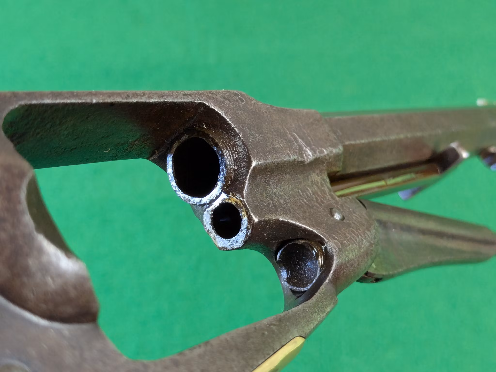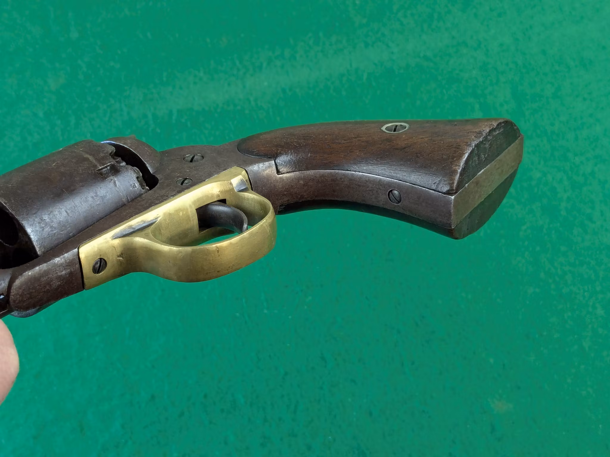 Chokladbrun patina jämnt fördelad över hela revolvern. Kolvsidor med mycket god passform. Den vänstra har en limmad spricka. Slagmärken runt trumaxelns fingergrepp.