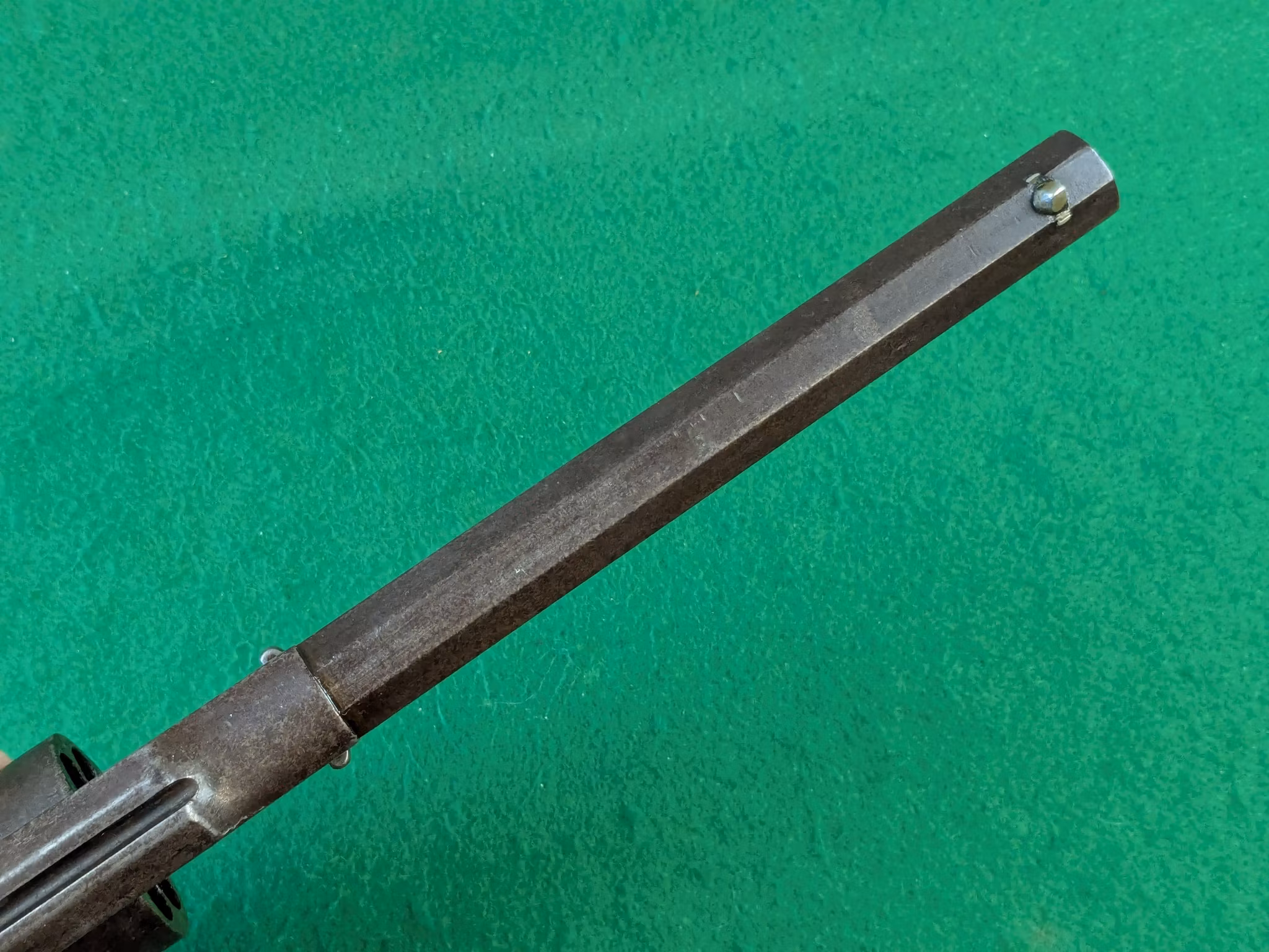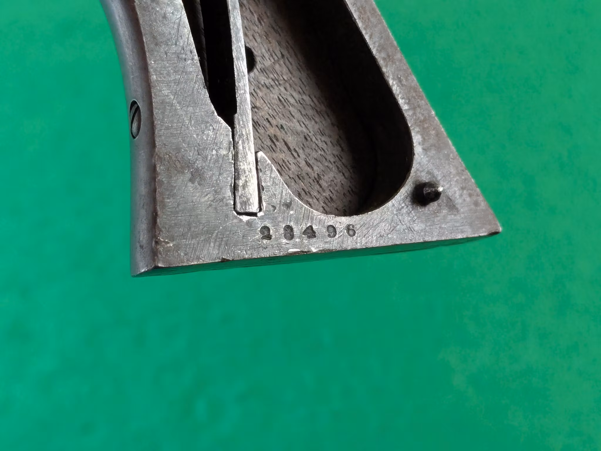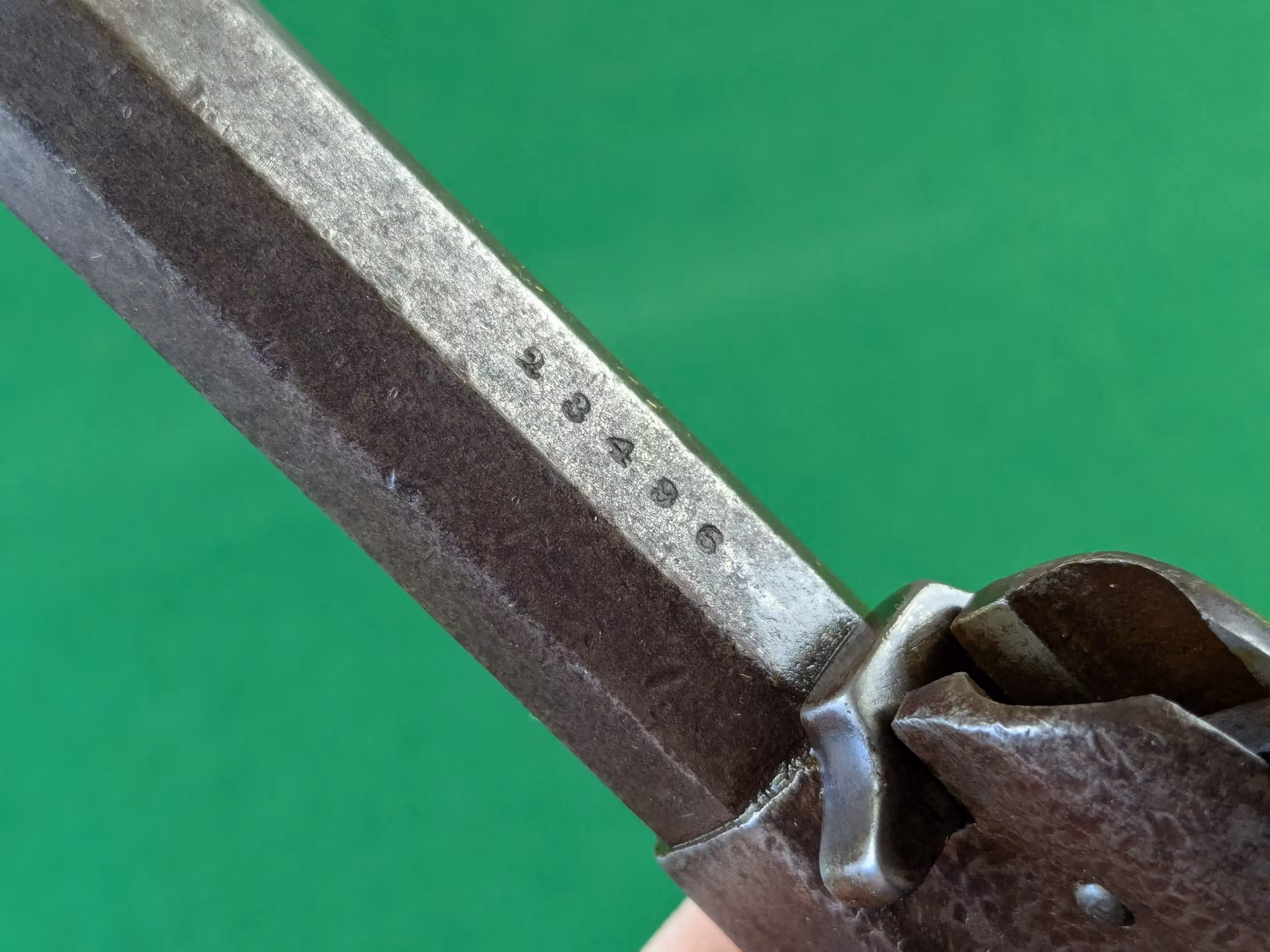Militära kontrollbokstäver syns över hela vapnet. Pipadress i två rader med orden New Model bredvid, vilket är normalt för serienummerspannet. Det tidigare kornet på laxfot. Vänster kolvsida har spår av en kartusch. Samma serienummer på pipa och stomme. Varbygeln som är ett original från ett militärt exemplar likt denna, har fått sitt serienummer bortfilat vid inpassning mot den här revolverna stomme.