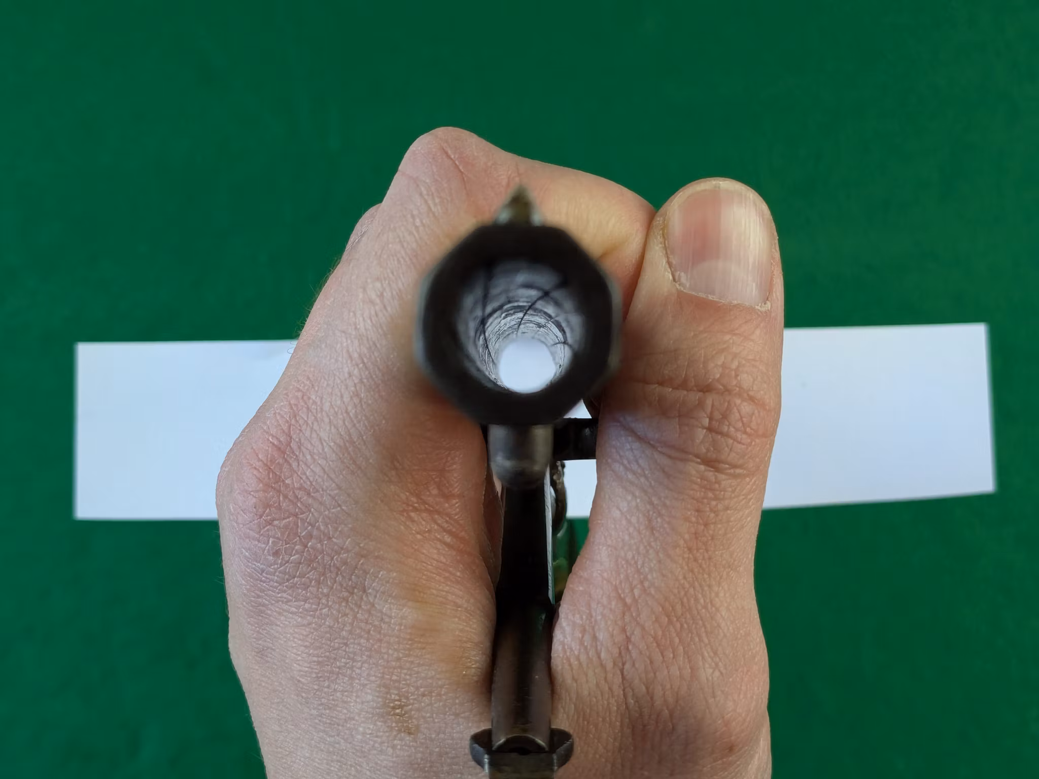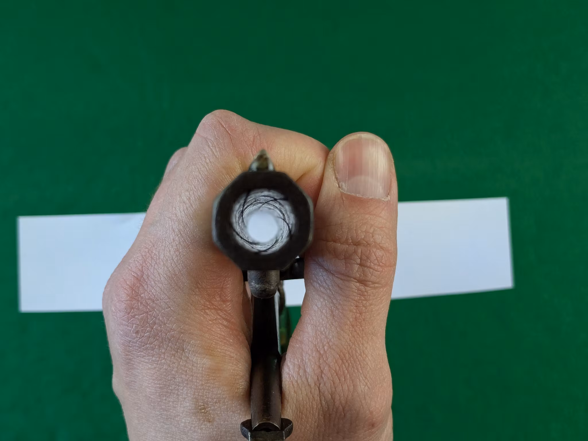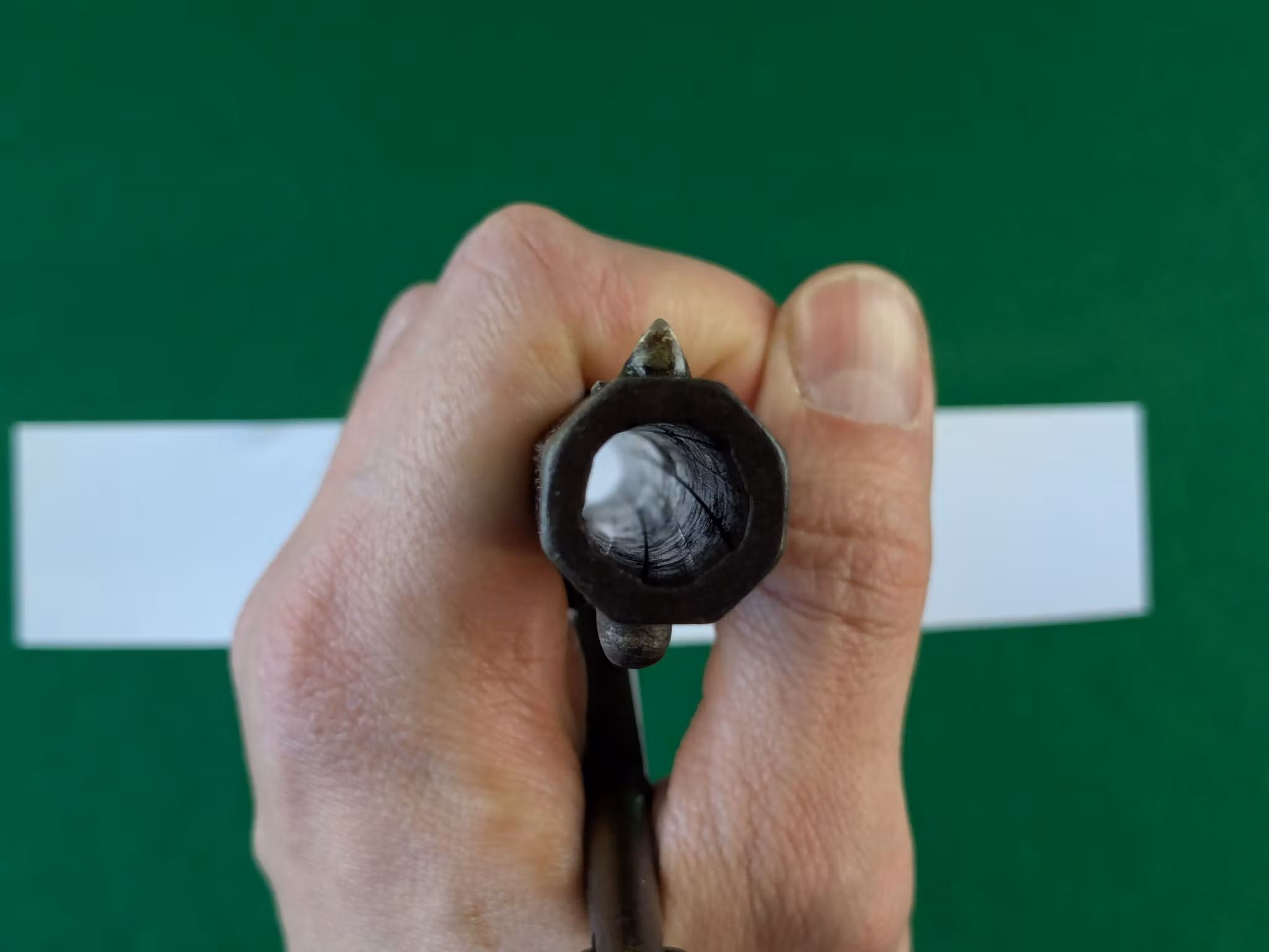Militära kontrollbokstäver syns över hela vapnet. Pipadress i två rader med orden New Model bredvid, vilket är normalt för serienummerspannet. Det tidigare kornet på laxfot. Vänster kolvsida har spår av en kartusch. Samma serienummer på pipa och stomme. Varbygeln som är ett original från ett militärt exemplar likt denna, har fått sitt serienummer bortfilat vid inpassning mot den här revolverna stomme.