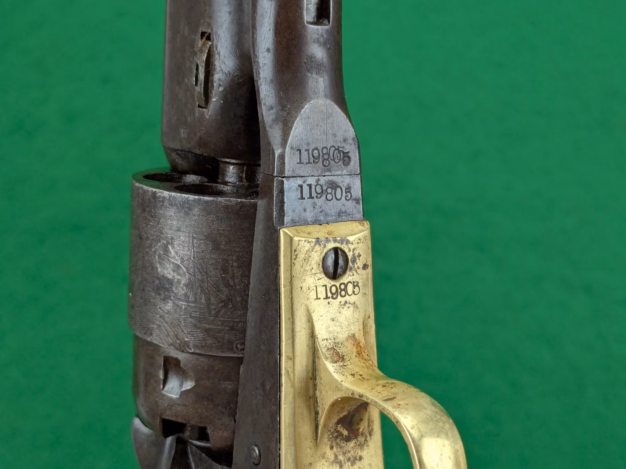 Colt Model 1860 Army Model Revolver med serienummer 119805. Tillverkad år 1863 av Colt's Patent Firearms Manufacturing Company i Hartford, Connecticut.