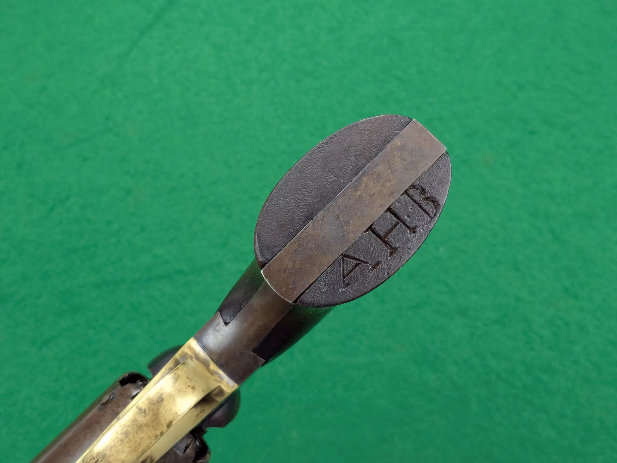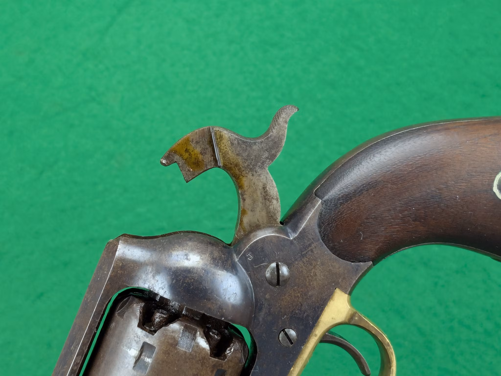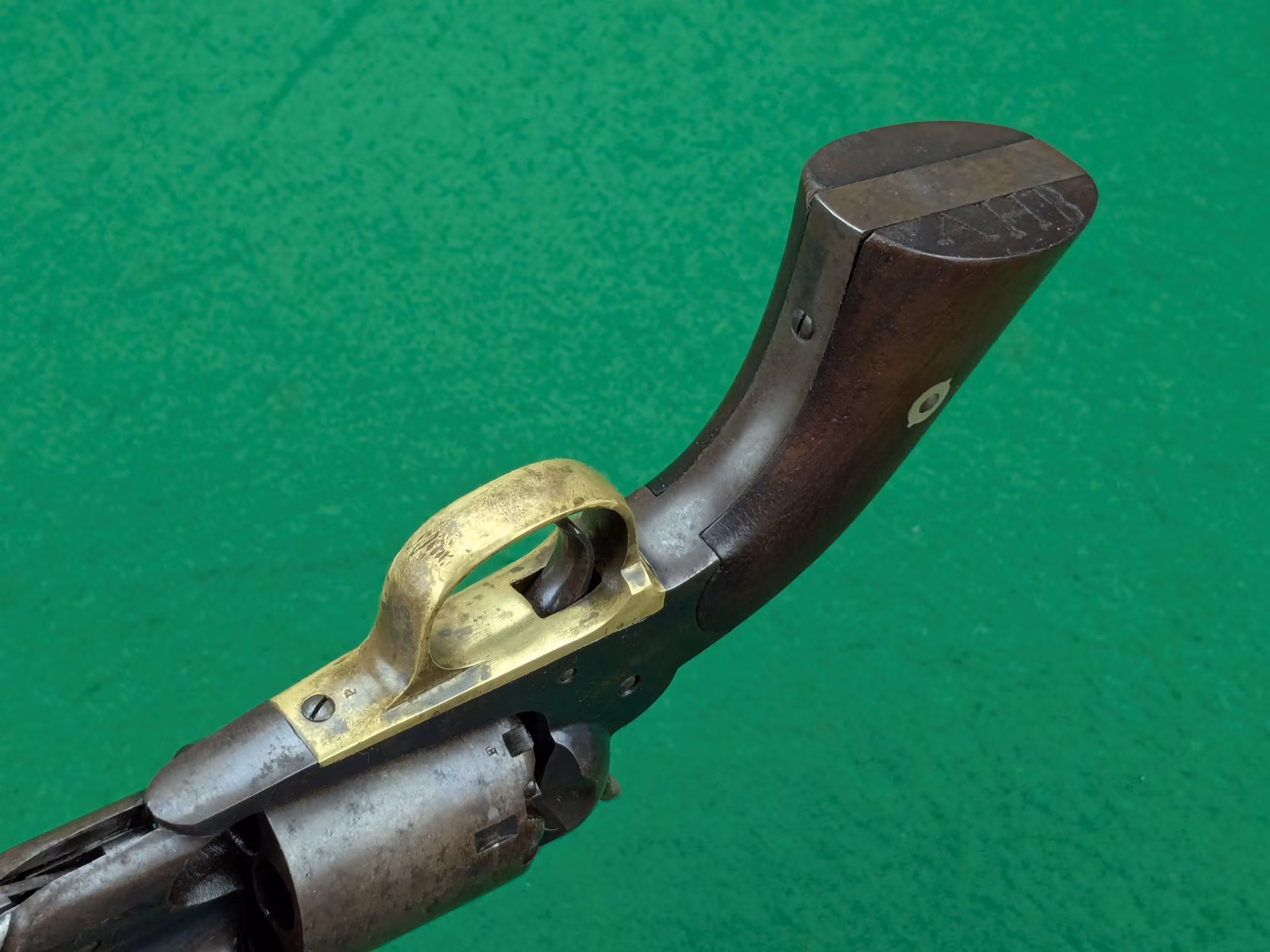 Kolvsidor med perfekt passform, alldeles säkert originalen sitter väl på revolvern. Den vänstra kolvsidan har en intressant inskripition undertill som möjligen kan vara kavalleristens initialer.