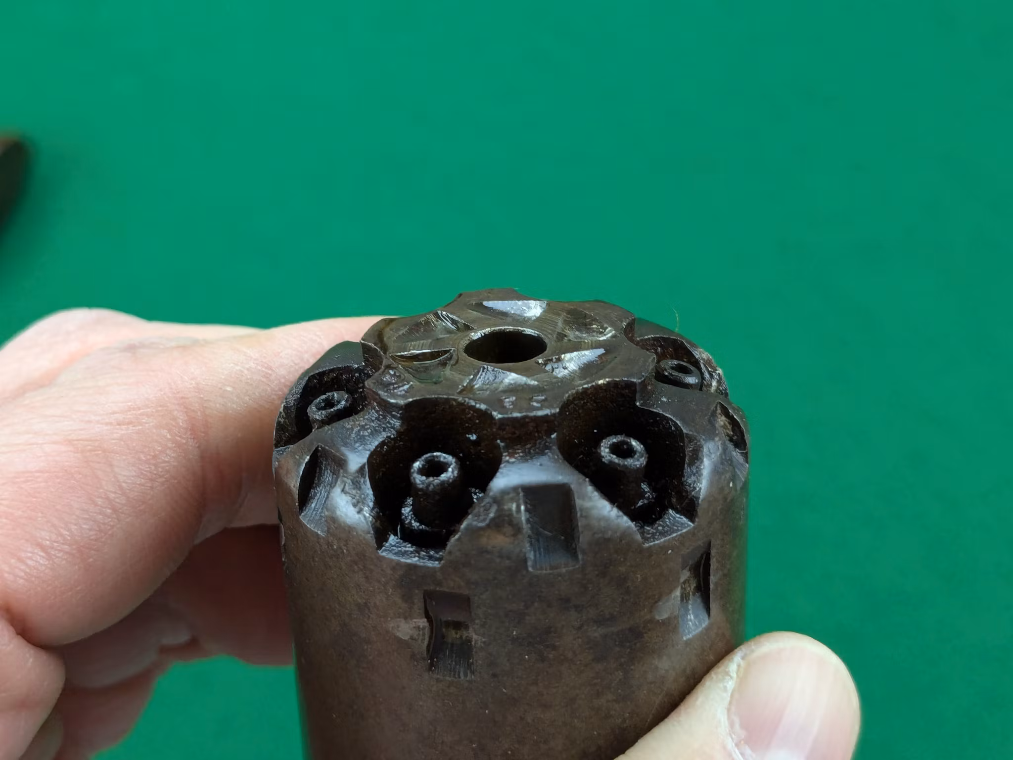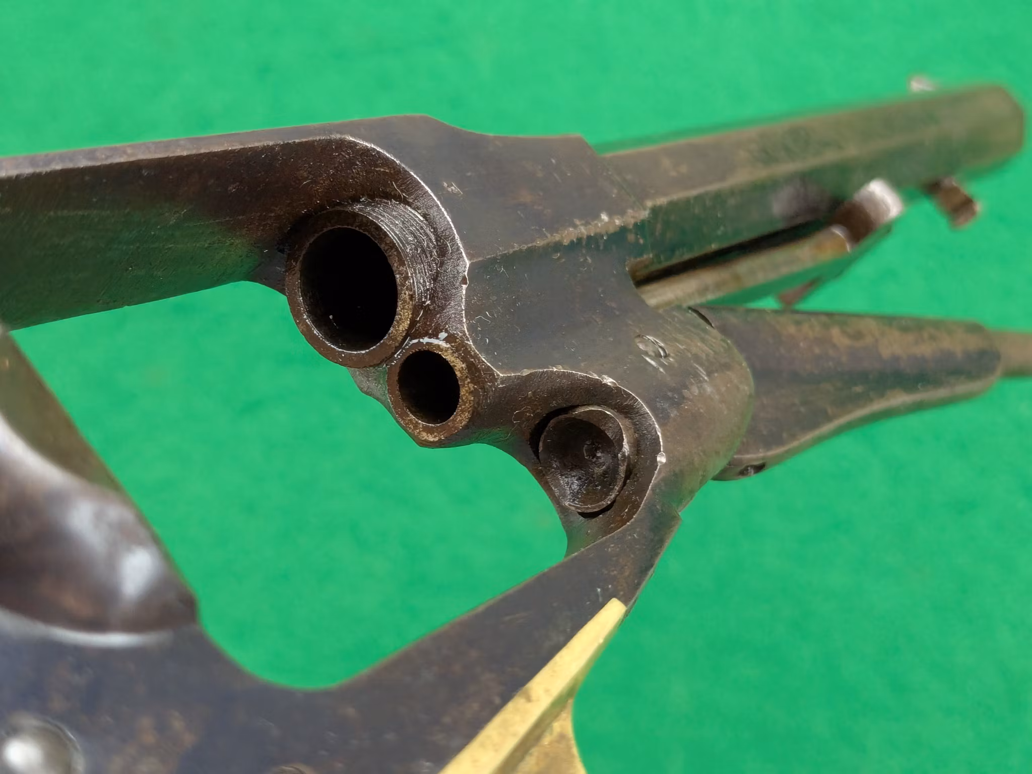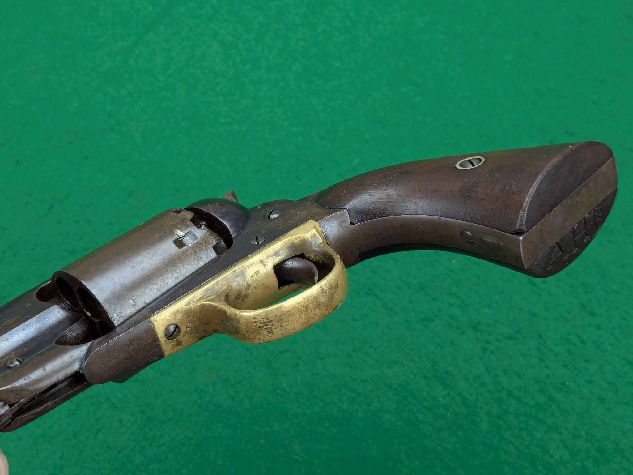 Kolvsidor med perfekt passform, alldeles säkert originalen sitter väl på revolvern. Den vänstra kolvsidan har en intressant inskripition undertill som möjligen kan vara kavalleristens initialer.