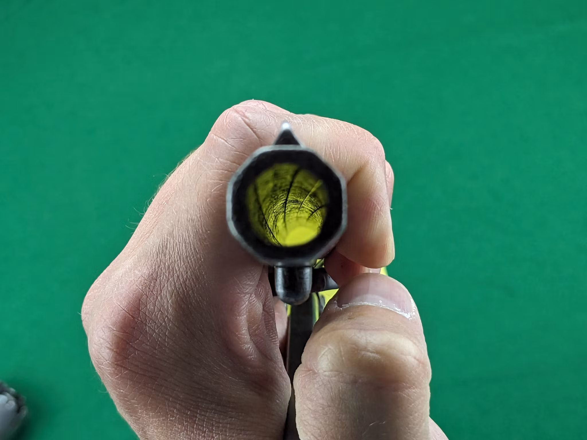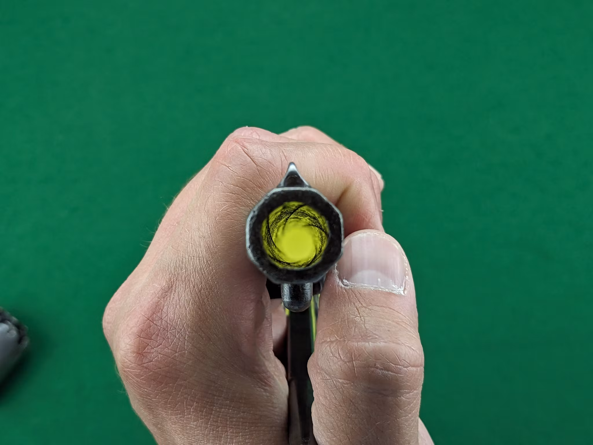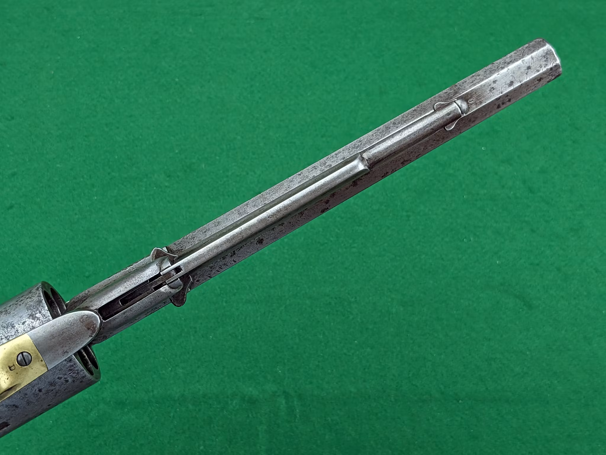Loppet är använt och har en jämn patina som inte är blank. Men tydlig, djup räffling finns ännu och revolvern kommer att prestera fina träffbilder med de mjuka blykulorna. Spelet mellan trumma och pipan är 0,30 mm vilket är klart godkänt för skytte och inget stort mått alls.