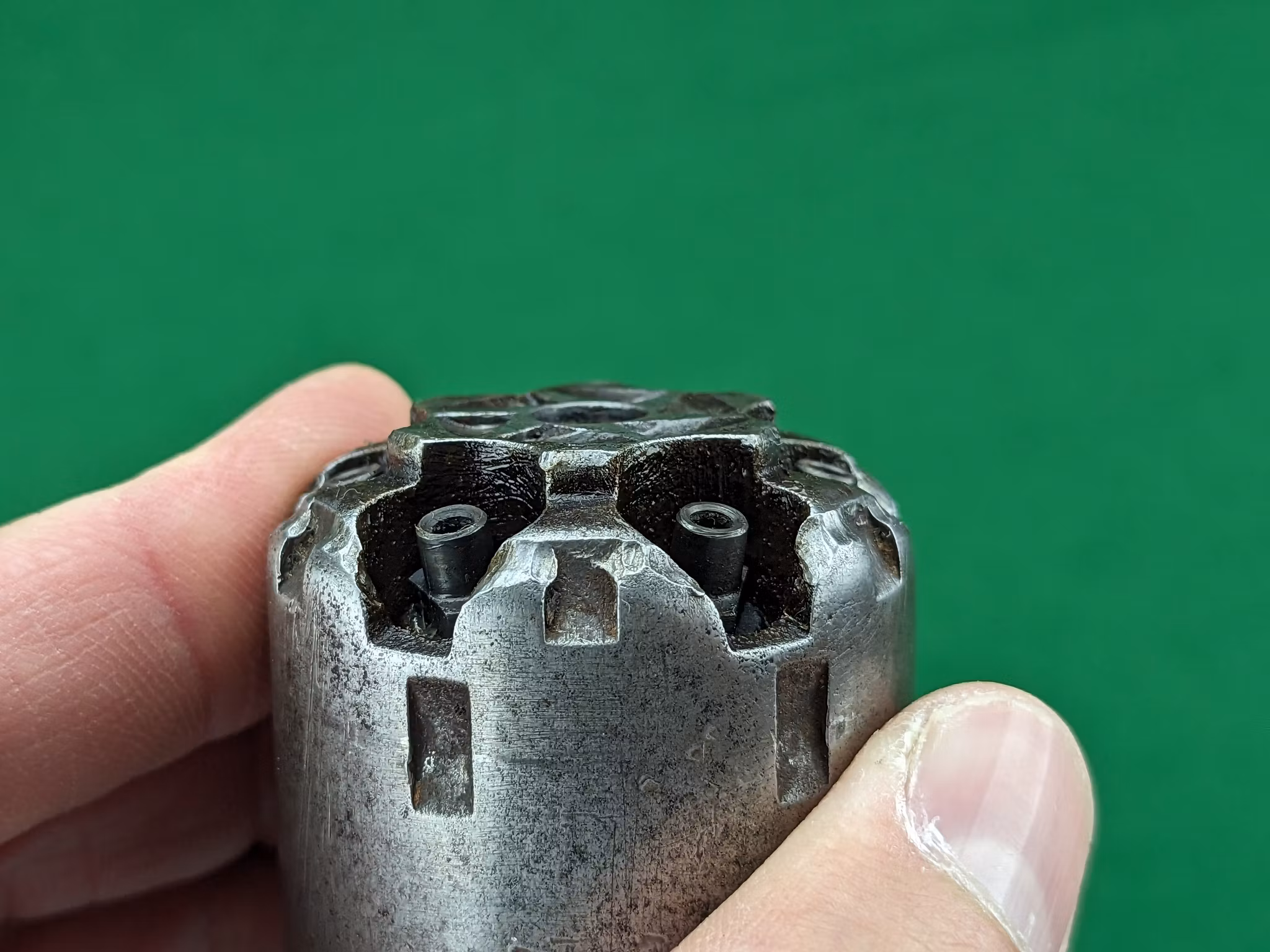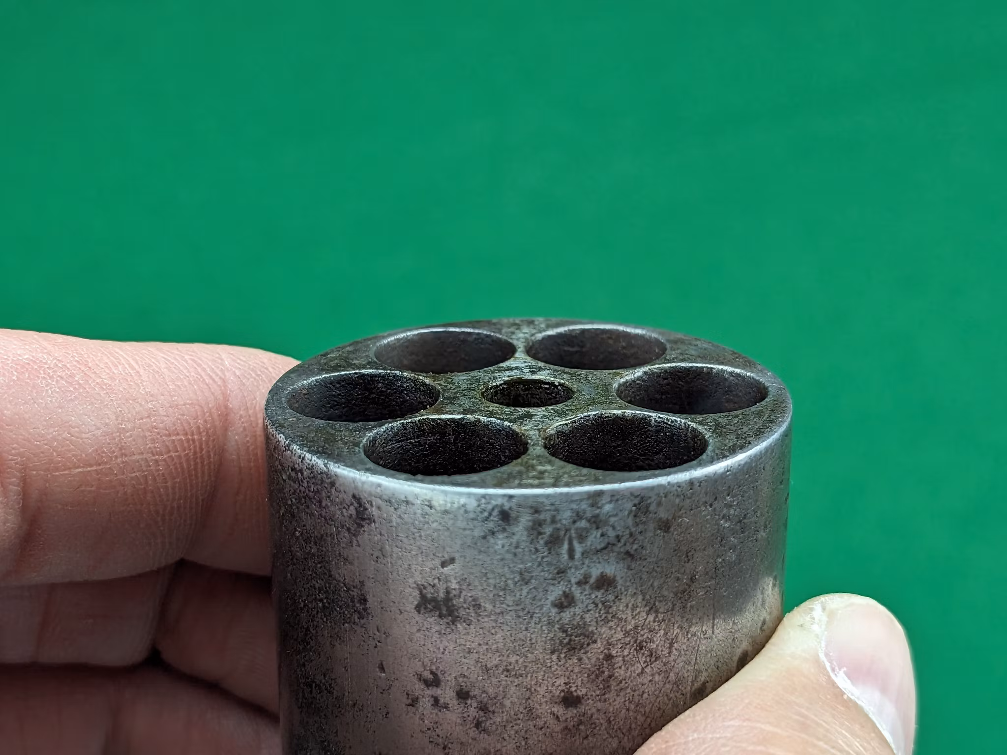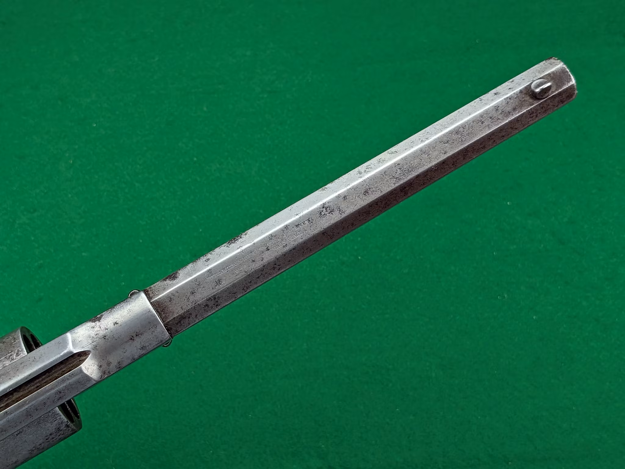 Loppet är använt och har en jämn patina som inte är blank. Men tydlig, djup räffling finns ännu och revolvern kommer att prestera fina träffbilder med de mjuka blykulorna. Spelet mellan trumma och pipan är 0,30 mm vilket är klart godkänt för skytte och inget stort mått alls.