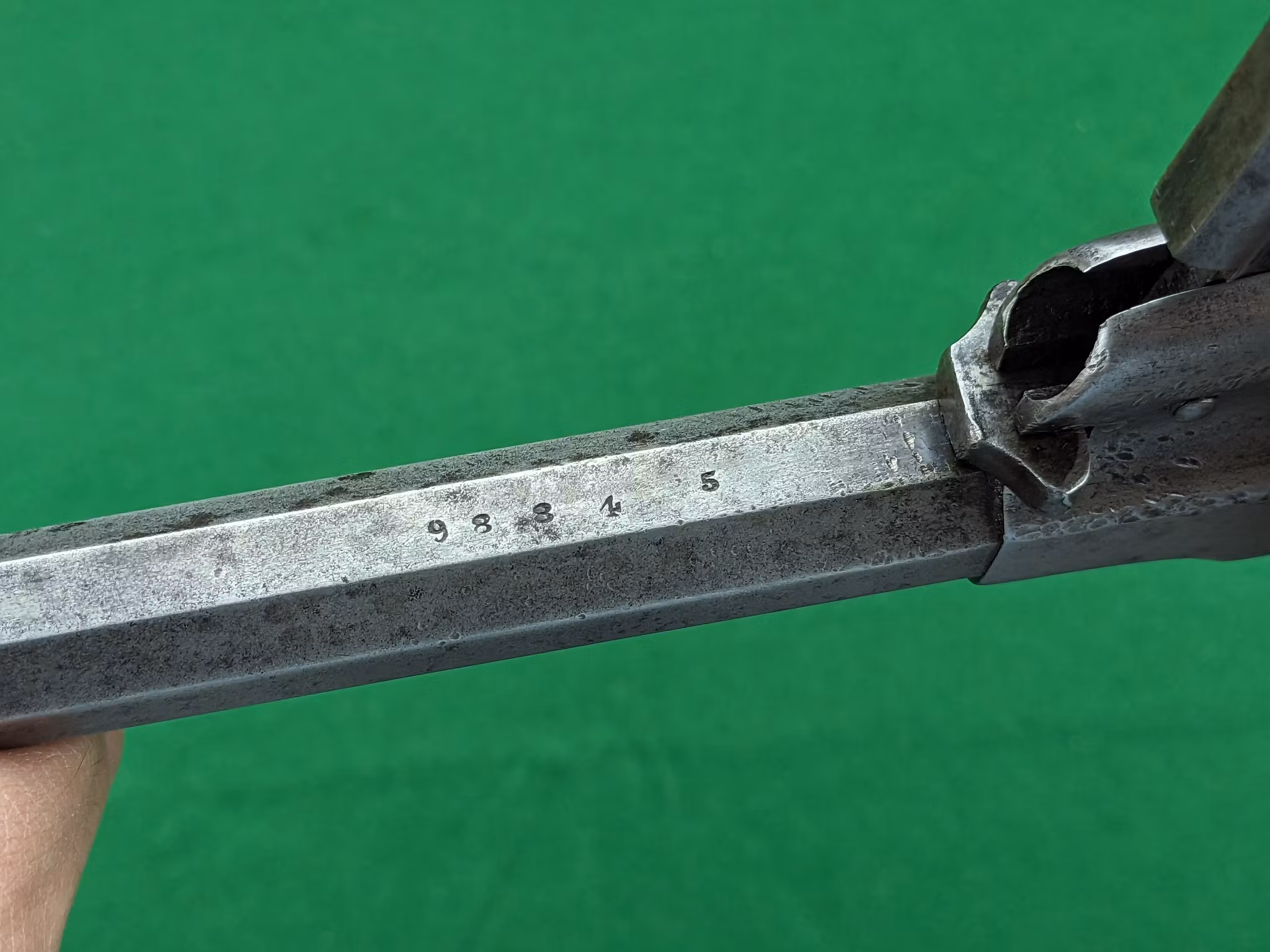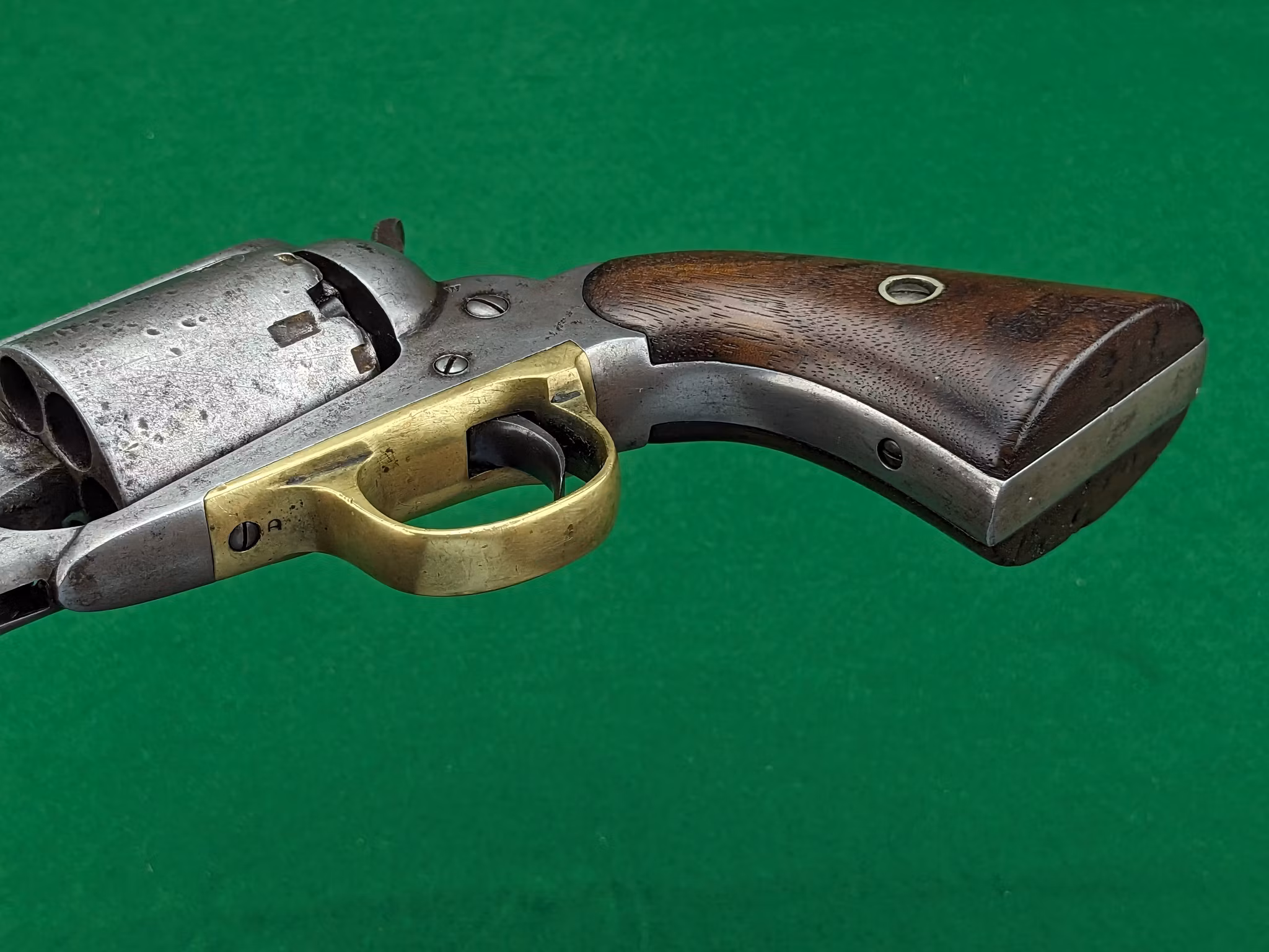Man finner en bevarad och läsbar treradig adress på pipans ovansida samt samma serienummer på pipa, stomme och varbygel. Inga synliga serienummer på trumma eller kolvsidor, vilket är helt normalt med en revolvern i detta skick. Många New Model Army hade inte serienummer på trumman från början. Det är ännu oklart hur processen såg ut kring detta och varför så många återfinns med onumrerade trummor. Kolvsidorna hade serienummer i blyerts på insidan och dessa har med tiden tvättats bort och suddats ut till oläslighet på detta exemplar. Tydligt är att kolvsidorna på revolvern i fråga är de ursprunliga då passformen är så pass god samtidigt som de är i så gott skick.