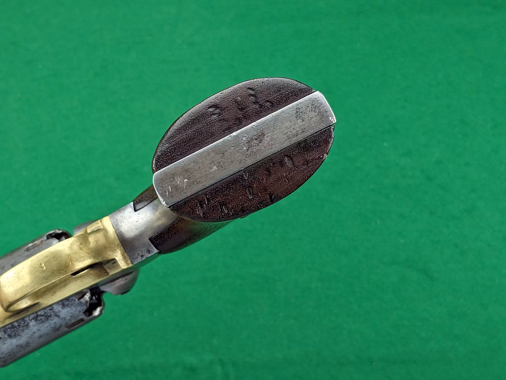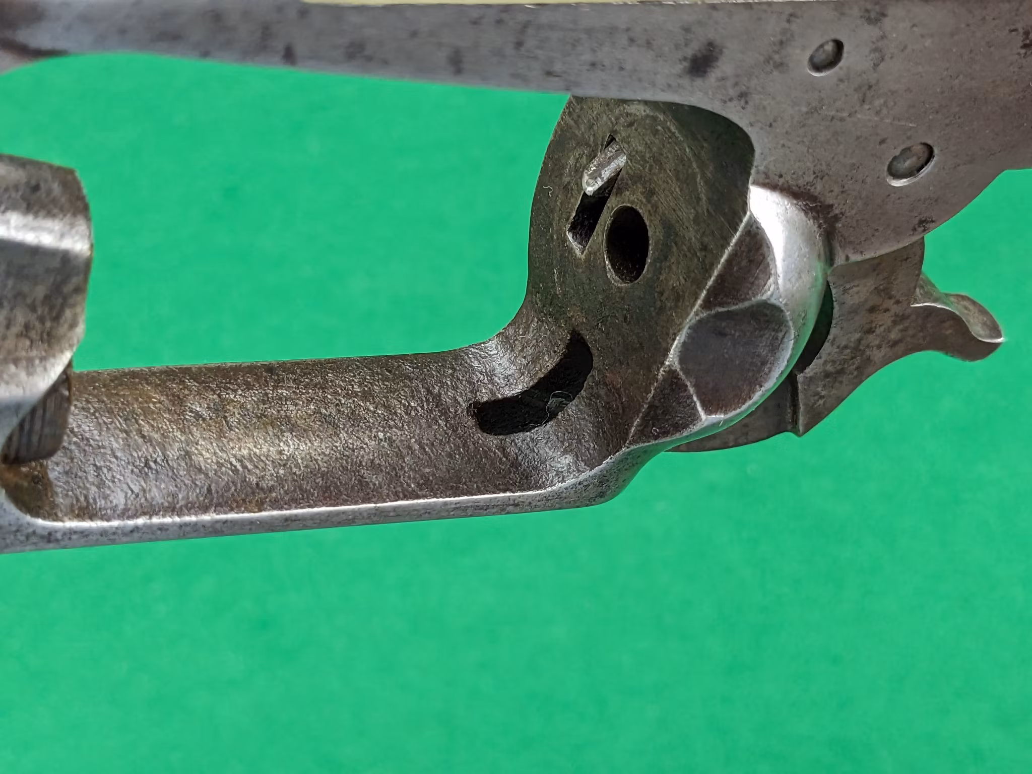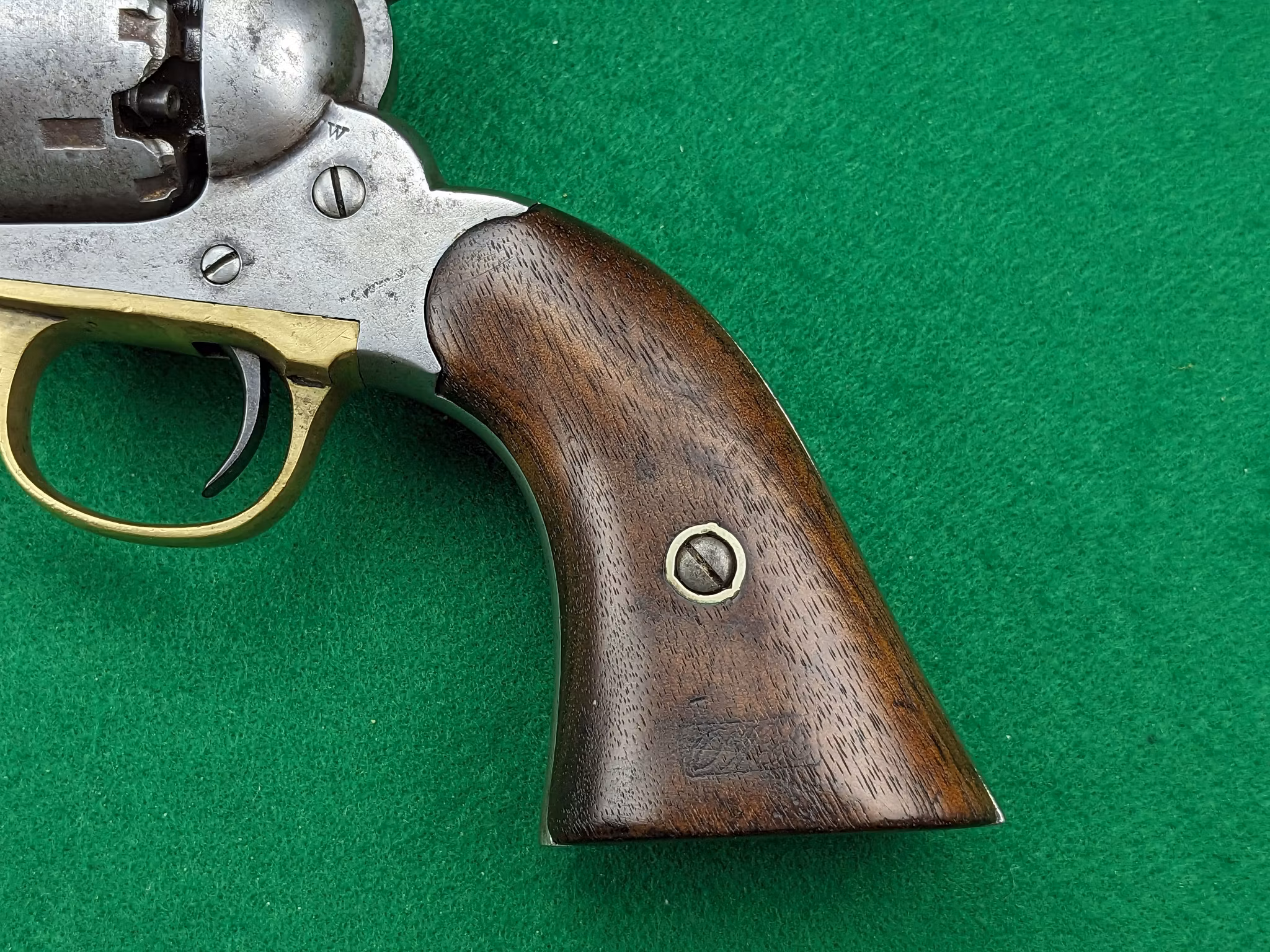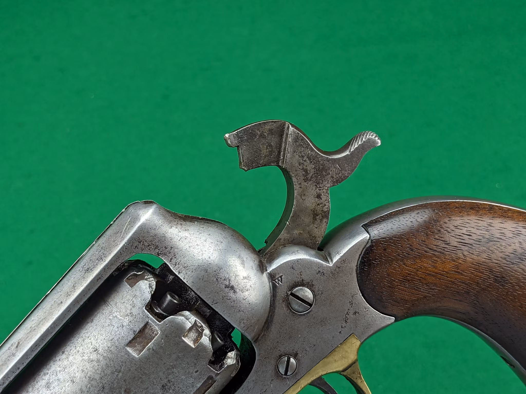 Mekaniskt är revolvern i mycket gott skick idag. Vapensmeden som vi samarbetar med har gått igenom revolvern i sina beståndsdelar och inget har lämnats åt slumpen. Nya nipplar från Track of the Wolf sitter monterade. Timingen har justerats till perfektion och matningen är idag distinkt med ett naturligt lätt slitet läge i helspänn. Helspänn är alltså inte slitet utan det är trumaxlen och trumstoppet som är något lätt slitna, vilket är naturligt. Detta medför ett lätt glapp radiellt och i rotationsriktningen som är så litet att det är försumbart i förhållande till funktionen på revolvern.