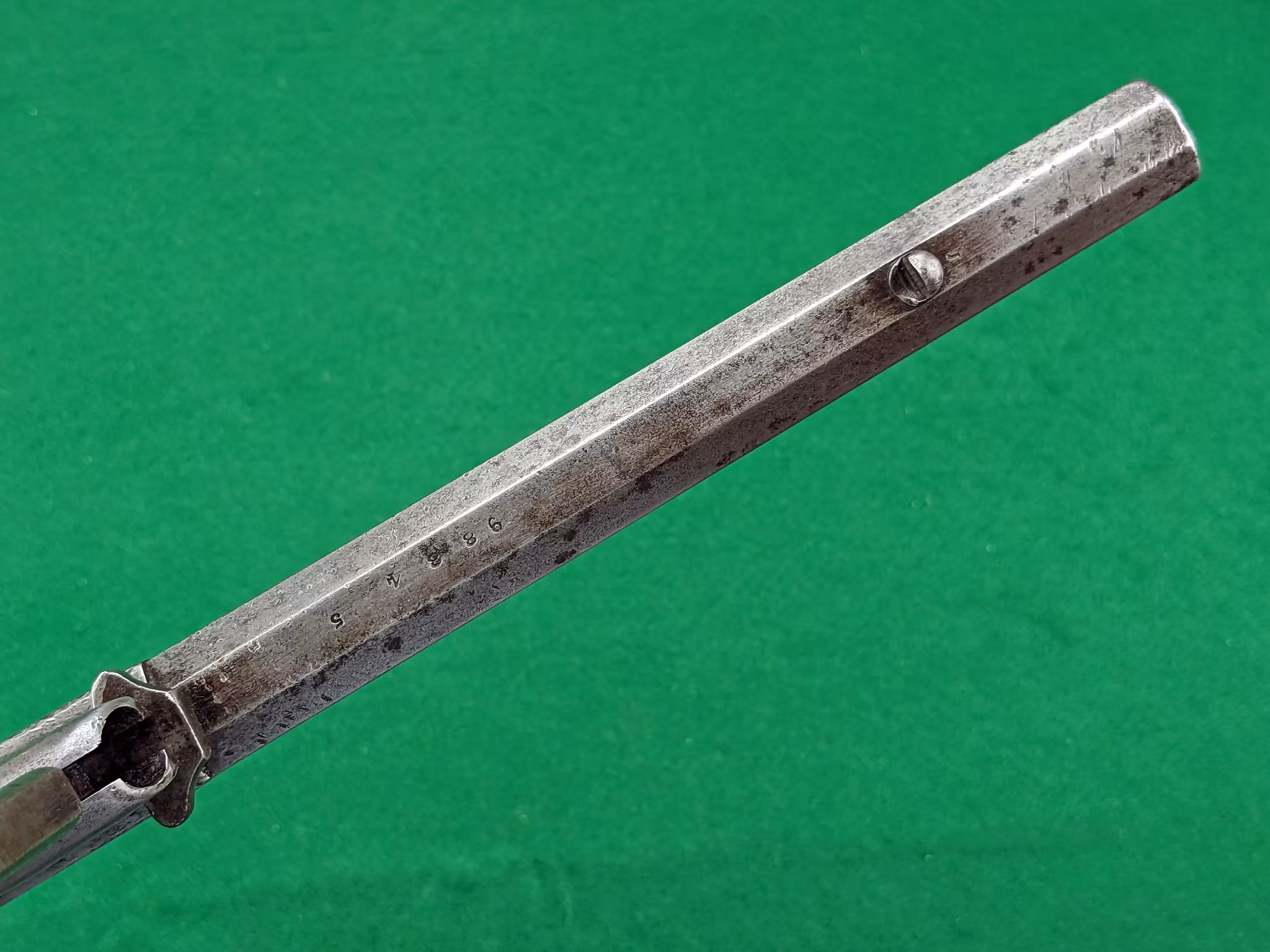 Ursprungligen blånerad, med flamhärdad hane. Varbygel av mässing och kolvsidor av oljad valnöt.