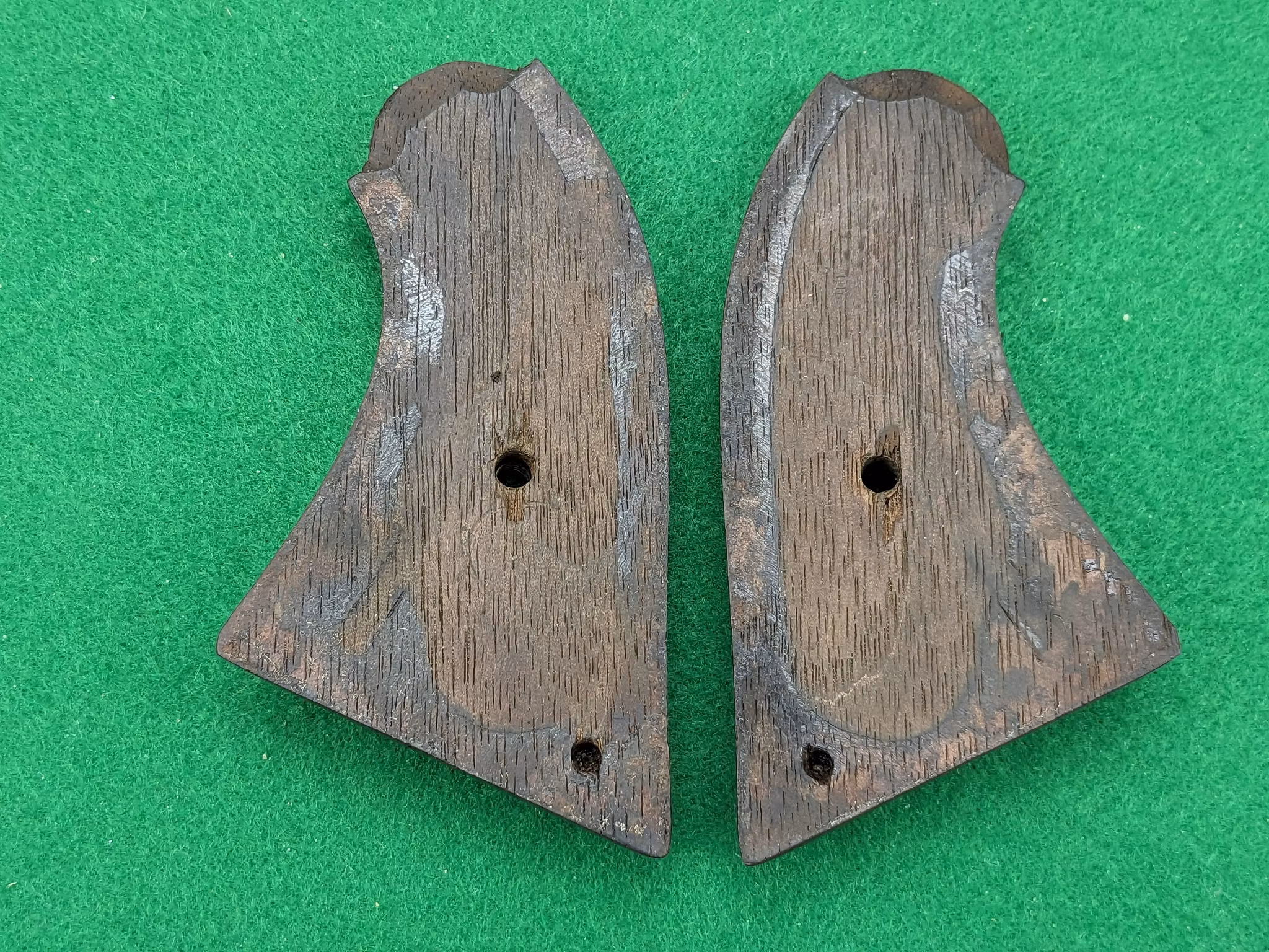 Mestadels helt grå revolver med mindre partier av fläckvis mycket ytliga partier av pitting från fuktig förvaring. Man finner slagmärken främst invid trumaxlens fingergrepp. Laddarmen och stommen har små bevarade områden av oförvanskad blånering, i de mest skyddade skrymslena.