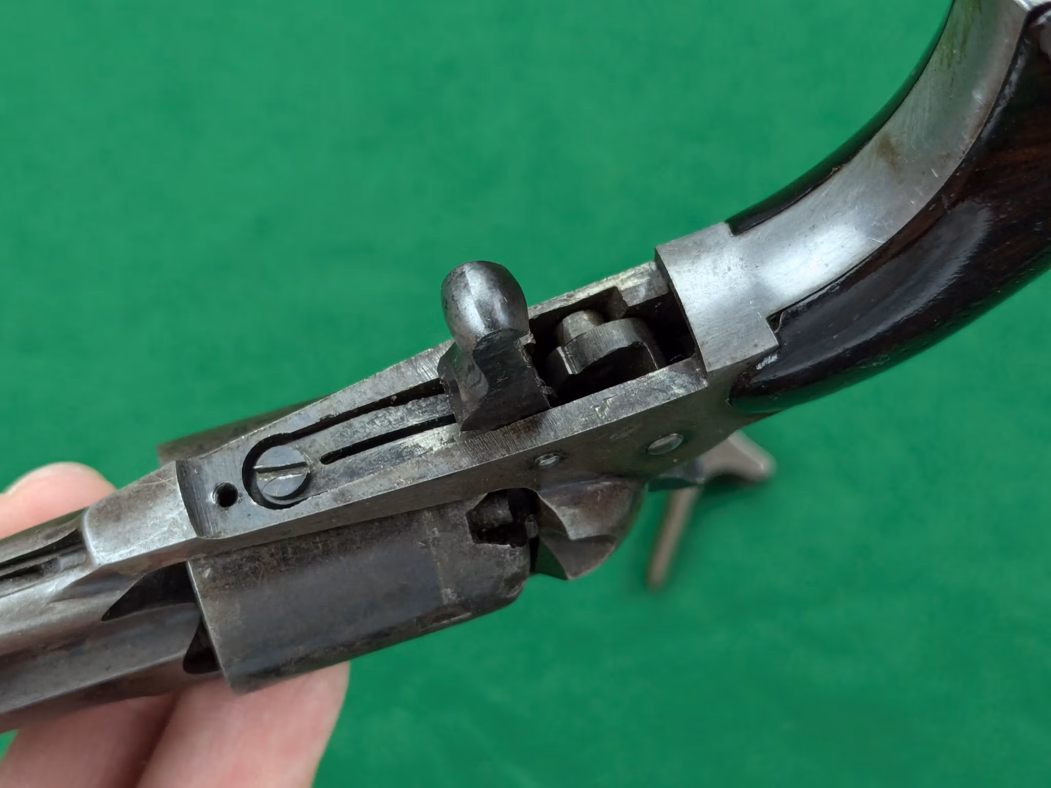 Ett överlag välbevarat exemplar med mycket finish bevarad. Pipans blånering är nästan helt bevarad, men den annorlunda ythärdningen på stommen har medfört att blåneringen där endast finns kvar i de mest skyddade skrymslena. Kolvsidorna som generellt är fina har en mindre tendens till sprickbildning som ändå håller ihop väl och med en välbevarad ytfinish. Trumman har en förhållandevis låg nivå av slagmärken kring nippelbrunnarna från att hanen släppts felaktigt. Nipplarna är i gott skick trots att de troligtvis är antika och duger för provskjutning utan problem.