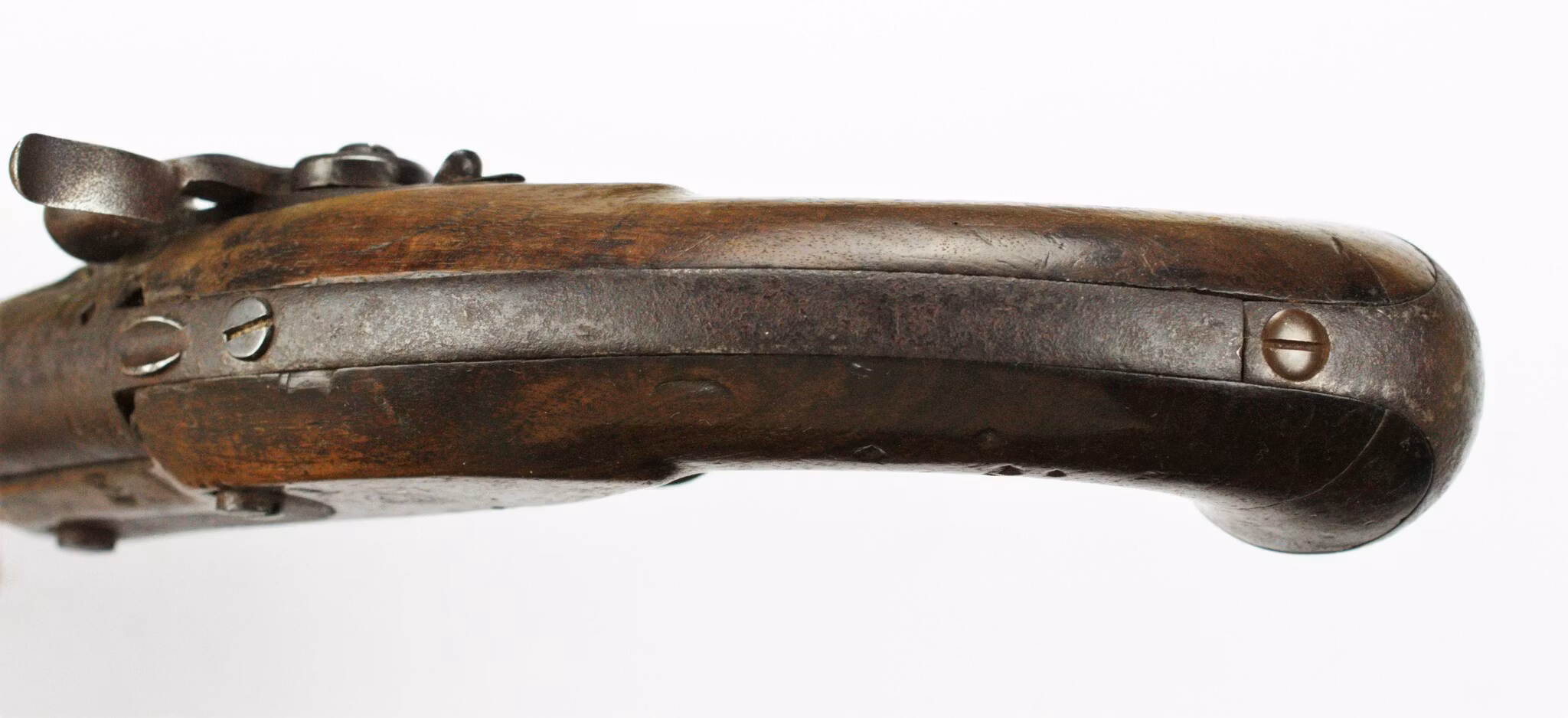Jämn brun patina över alla metalldelar. Tydliga märkningar, välbevarade. Samtliga delar intakta. Nippel ej lossad. Den bör byta ut om man avser att skjuta med pistolen. Vi ser den som ett samlarobjekt men det lär inte vara några större hinder att skjuta med pistolen efter lite pyssel. Mindre sprickbildning här och var i kolven men inget som stör funktionen eller hållfastheten nämnvärt.