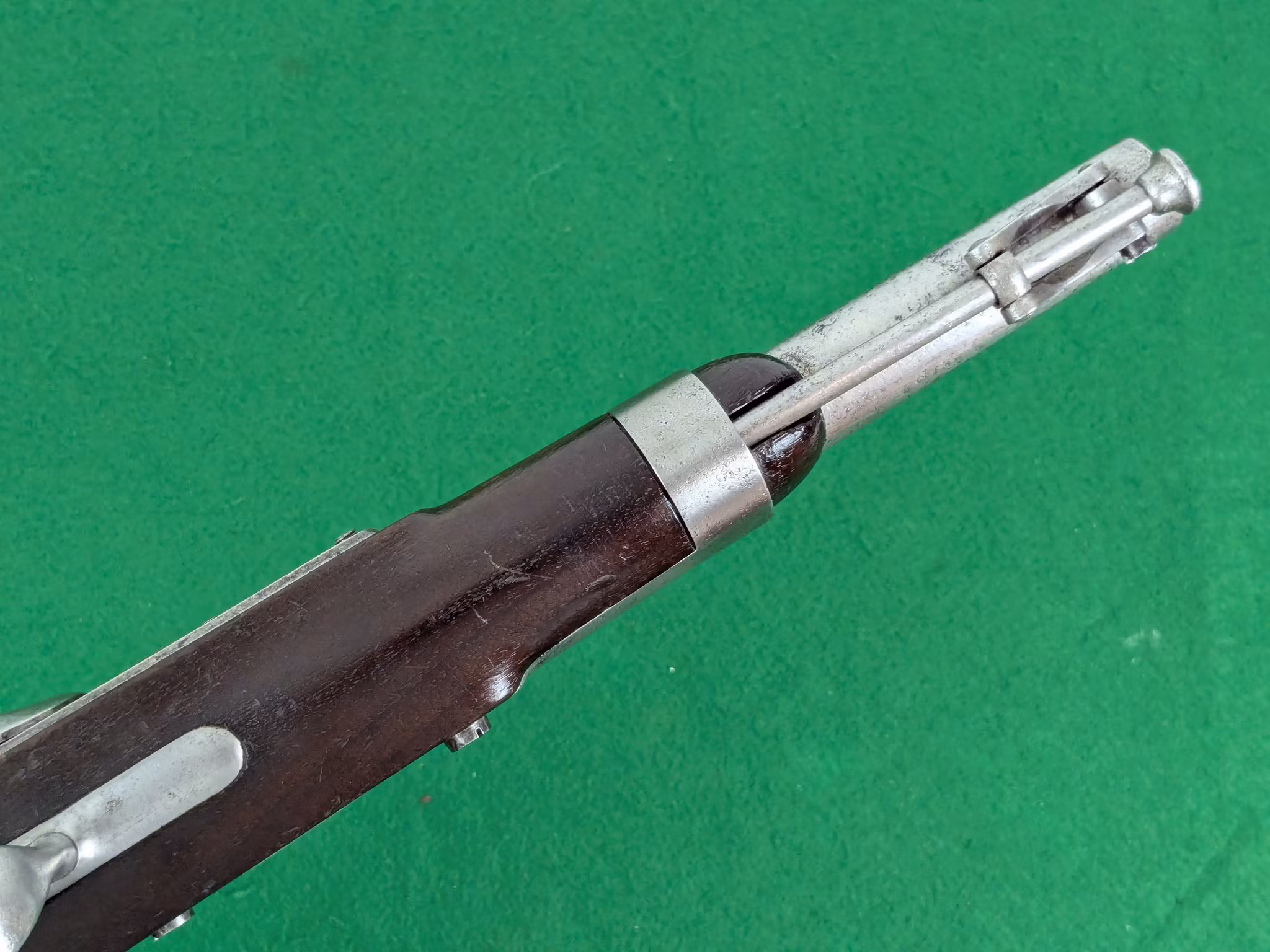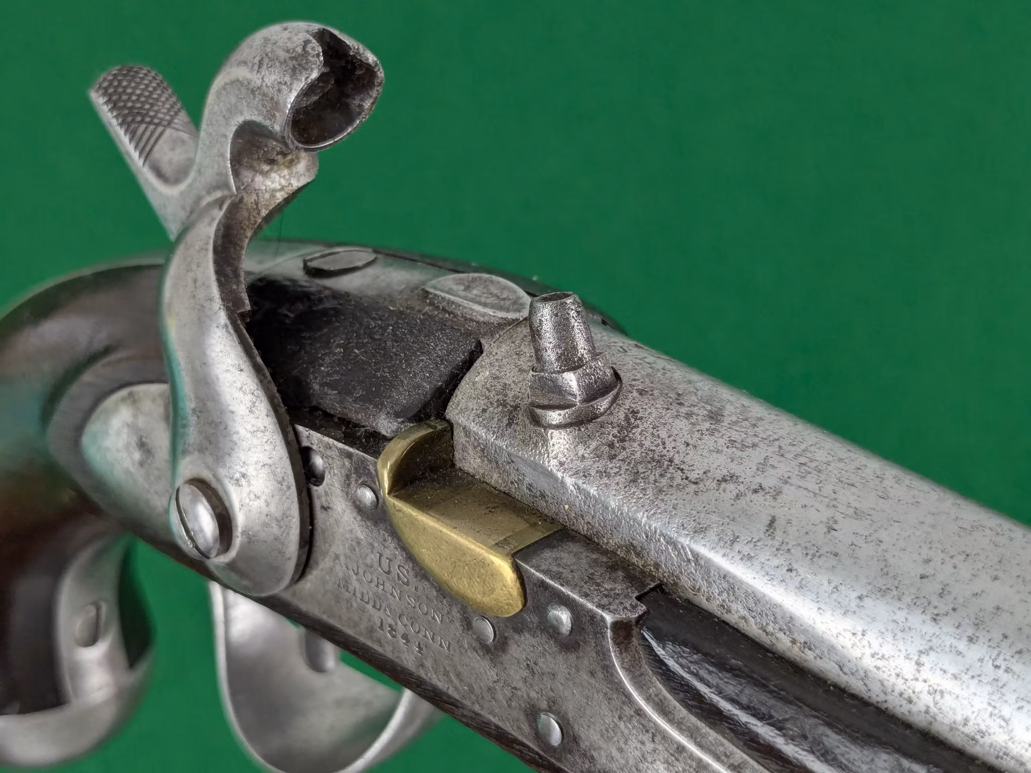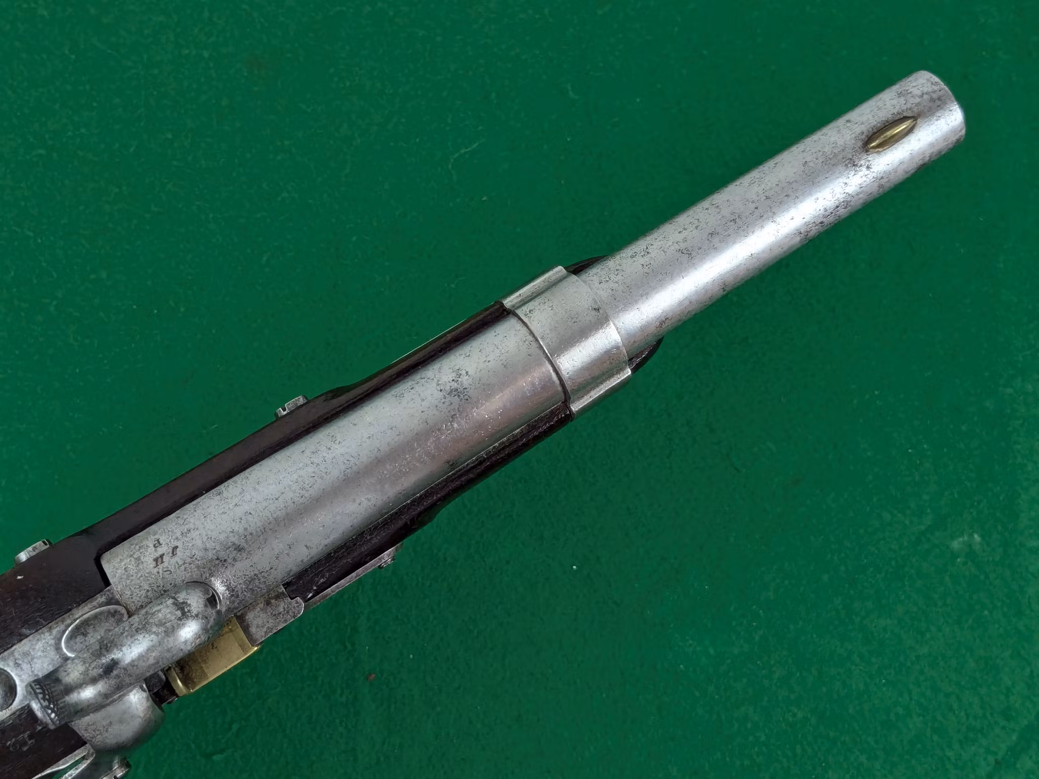 God spänst och tydliga, säkra upphak ett och två. Nippeln i fint skick. Loppet mestadels blankt med enstaka mindre skönhetsfläckar som kanske går att rengöra bort, svårt att se, men de är ytliga. Ett bra lopp. Finns inget som tyder på att den inte skulle kunna provskjutas. Man bör se efter att tändkanalen från nippeln är fri innan man ger sig på att ladda pistolen.