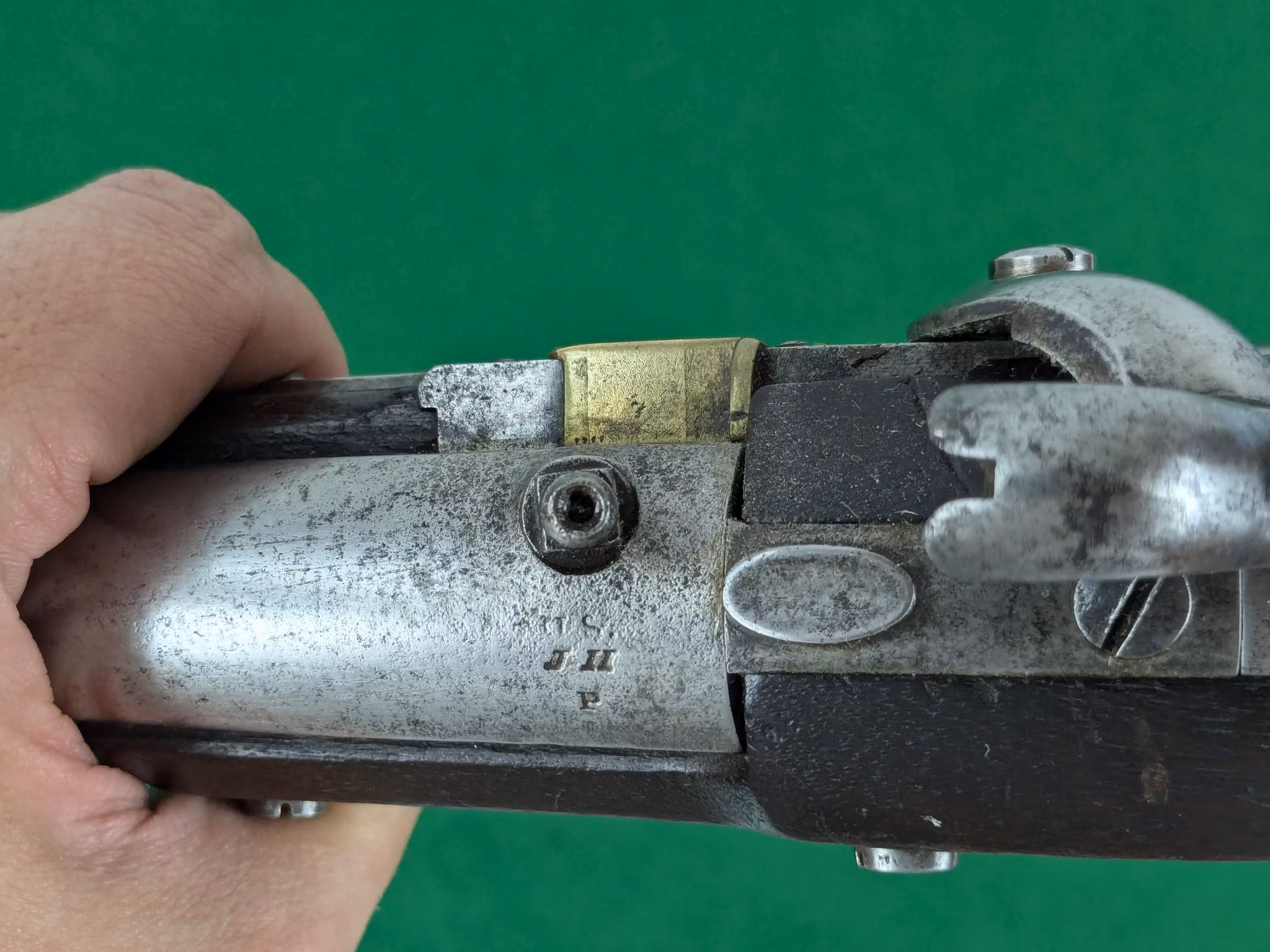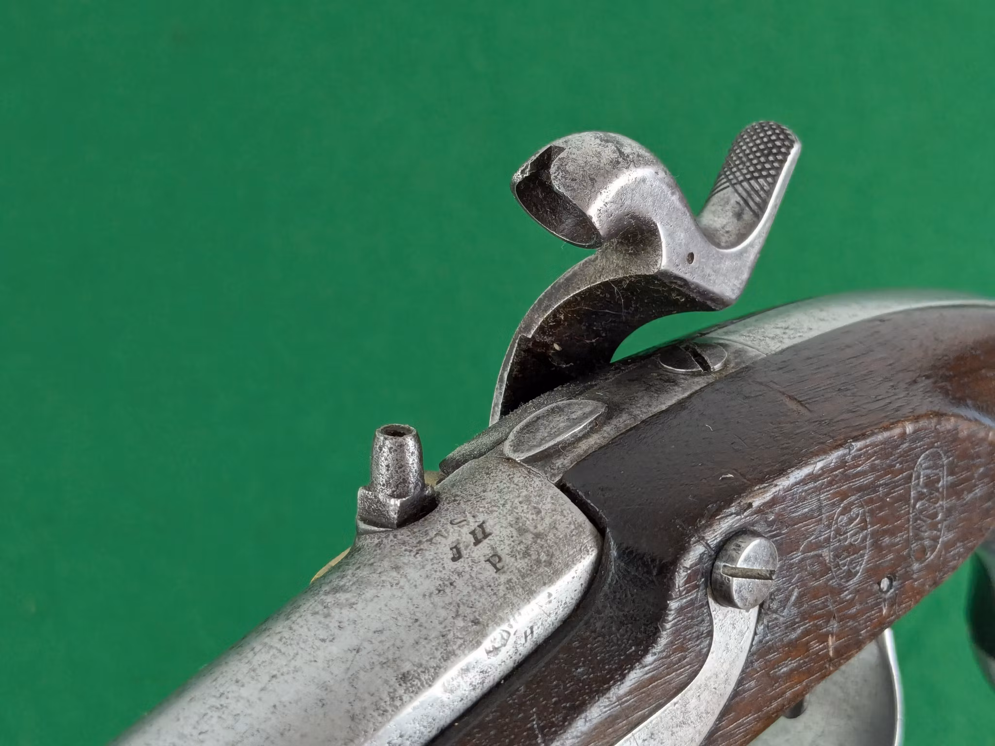 Konverteringstypen är av varianten som utfördes av militären själva. Den är även märkt med provtrycknings och militära inspektionsstämplar på pipan. Vänster sida av kolvträet på motsatt sida av låset är märkt med två kartuscher av Joseph Hannis och en W.O.J.